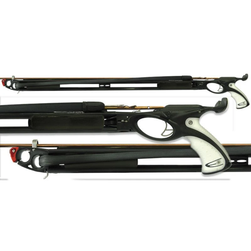 - Pour les longueurs de 110, 120 et 130 cm : équipées avec flèche 7mm Sandvik et double sandows circulaires shockwave 16mm et obus dyneema vissés